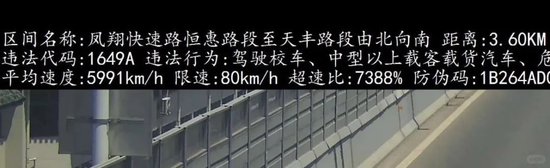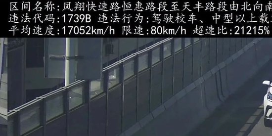 据其上传的相关处罚信息显示,其在江苏无锡凤翔快速路行驶时,被记录到车速达17052km/h,该路段限速80km/h,超速比高达21215%。