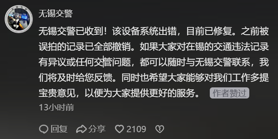 4日深夜,无锡交警通过官方账号回应称:已收到!该设备系统出错,目前已修复。之前被误拍的记录已全部撤销。如果大家对在锡的交通违法记录有异议或任何交管问题,都可以随时与无锡交警联系,我们将及时给您反馈。