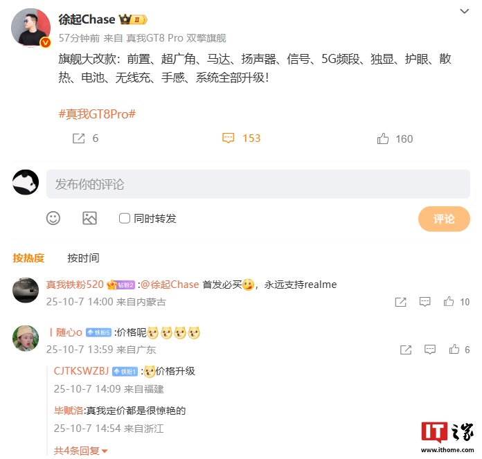 IT之家 10 月 7 日消息,真我 realme 副总裁、全球营销总裁、中国区总裁徐起今日发文预热真我 GT8 Pro 手机,他称该机定位“性能影像双擎旗舰”,拥有性能旗舰才有的骁龙旗舰电竞双芯和 2K 直屏,同时拥有性能旗舰没有的 2 亿潜望长焦,是目前行业唯一的骁龙 8 至尊 5 + 2K 直屏 + 2 亿长焦组合。
